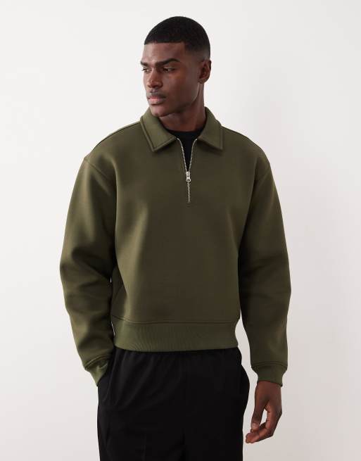 ASOS DESIGN boxy relaxed quarter zip sweatshirt with collar in khaki-green scuba-style fabric