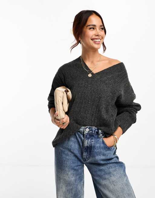 ASOS DESIGN boxy V-neck sweater in rib in charcoal