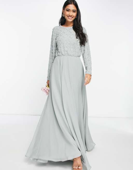 ASOS DESIGN Bridesmaid maxi dress with long sleeve in embellishment in olive