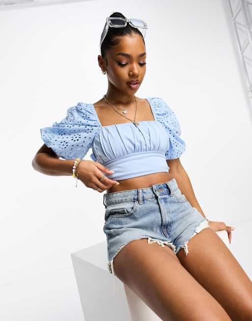 ASOS DESIGN broderie sleeve milkmaid top in blue