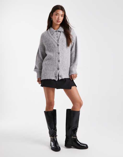 ASOS DESIGN brushed knit short sleeve polo & boyfriend cardigan set in light gray