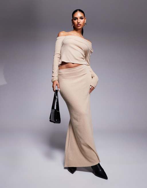 ASOS DESIGN brushed rib fishtail maxi skirt in stone - part of a set