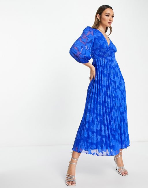 ASOS DESIGN burnout button up shirred waist pleated midi dress in cobalt blue