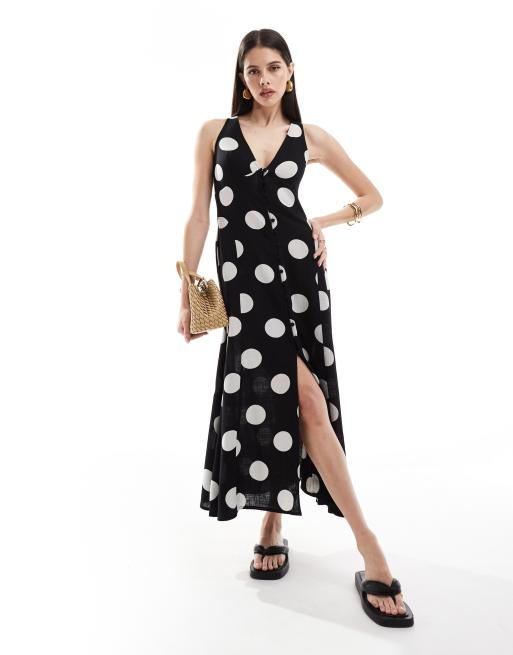 ASOS DESIGN button down linen look midi dress with full skirt spot print