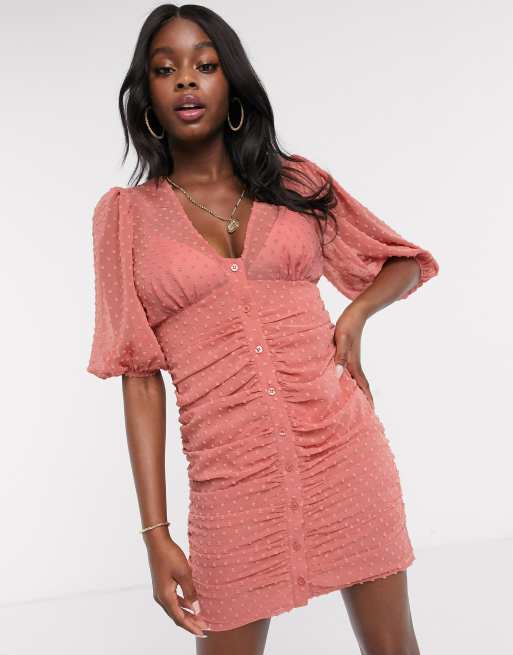 ASOS DESIGN button through dobby mini dress with puff sleeve in terracotta