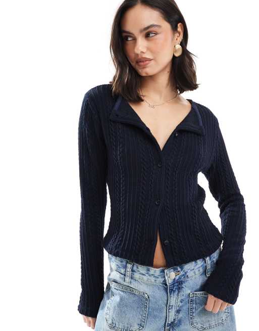 ASOS DESIGN button through shrunken cable cardigan in navy