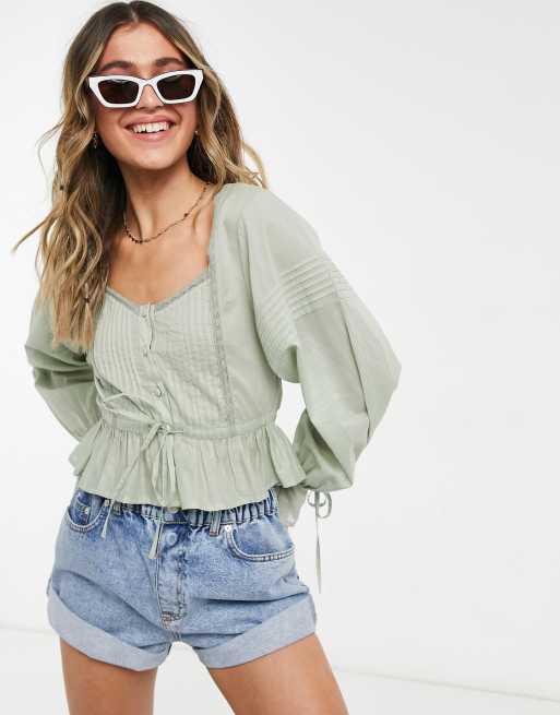 ASOS DESIGN button up top with pleated sleeve in sage