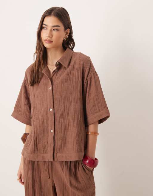 ASOS DESIGN Callie resort cheesecloth short sleeve beach shirt in mocha