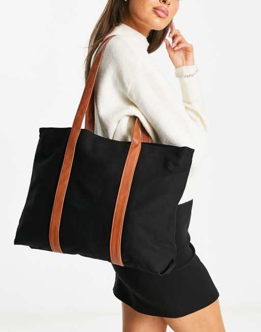 ASOS DESIGN canvas tote bag with laptop compartment with PU straps in black