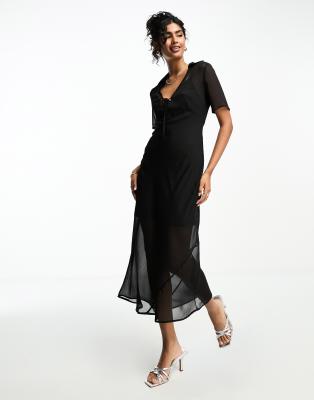 ASOS DESIGN chiffon short sleeve collar midi dress in black