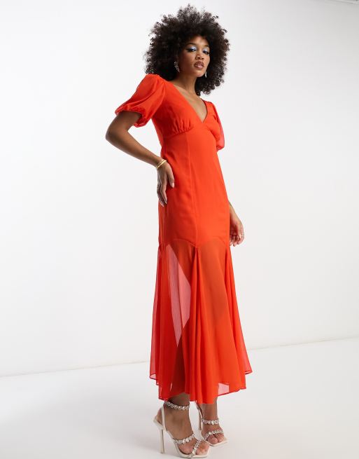 ASOS DESIGN chiffon v neck midi dress with flutter sleeves and flare hem in flame red