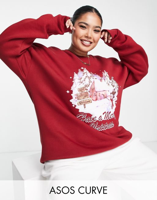 ASOS DESIGN Christmas oversized sweatshirt with retro scenic print in burgundy