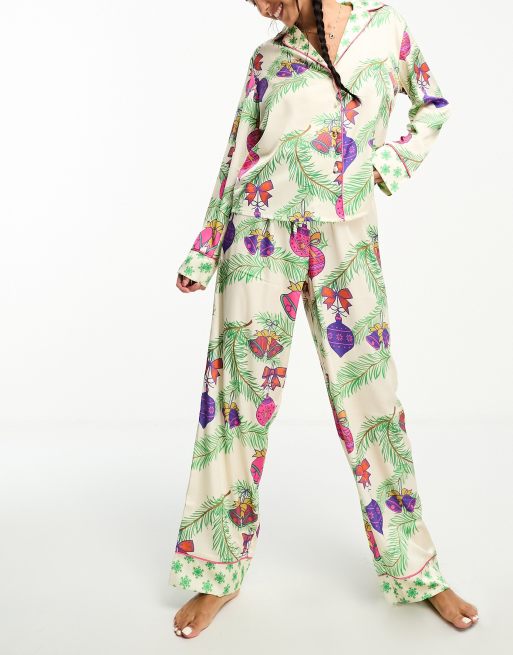 ASOS DESIGN Christmas satin botanical bauble shirt & pants pajama set in cream