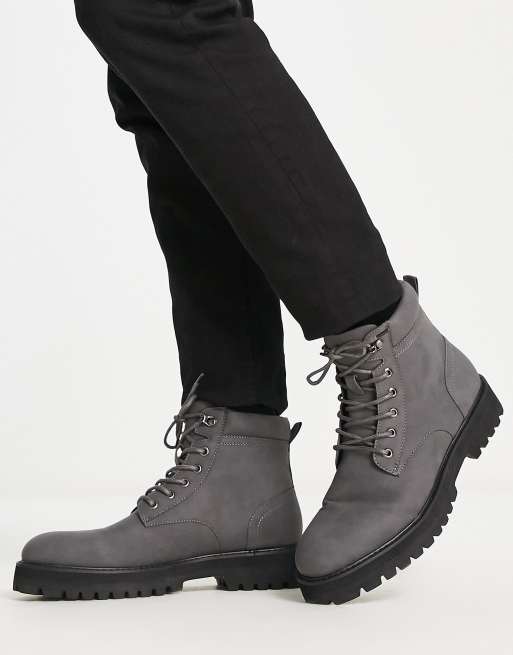 ASOS DESIGN chunky lace up boot with padded collar in gray faux leather with contrast sole