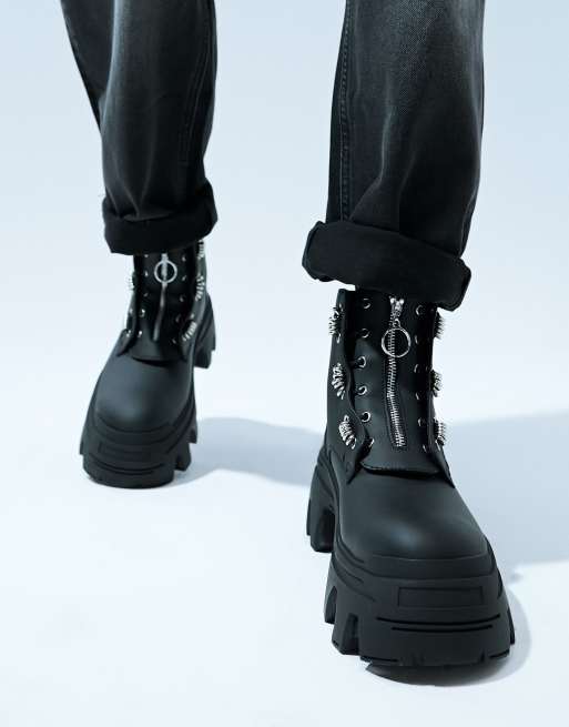 ASOS DESIGN chunky lace-up boots in black with silver monogram detail