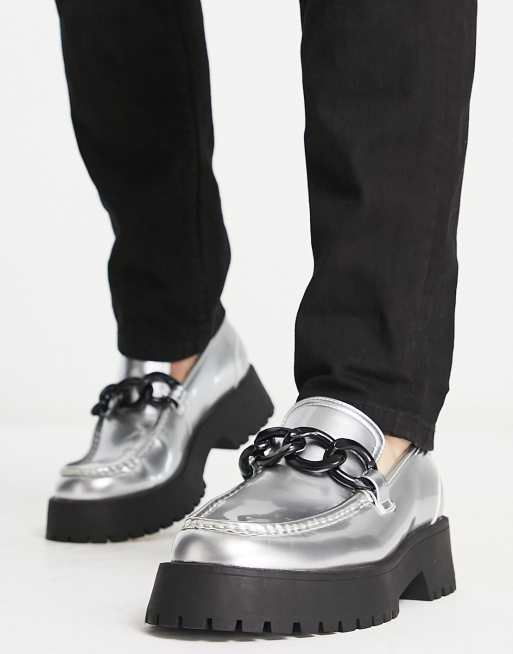ASOS DESIGN chunky sole loafers with oversized chain in silver faux leather with contrast sole
