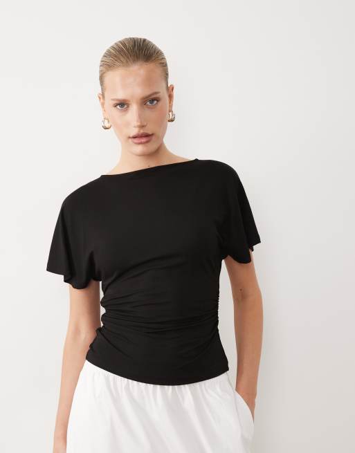 ASOS DESIGN cinched waist angel sleeve tee with v front detail in black