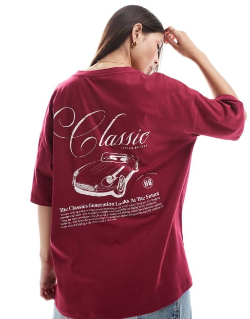ASOS DESIGN classic car graphic oversized tee in burgundy