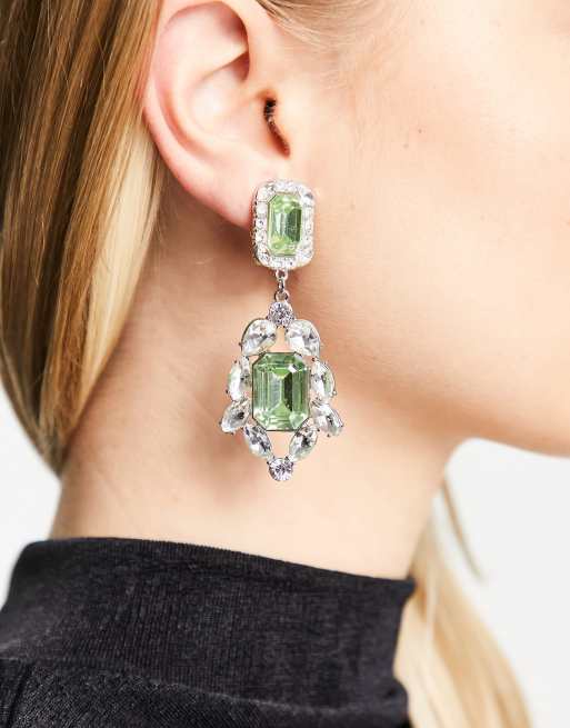 ASOS DESIGN clip on earrings with double drop green crystal in silver tone