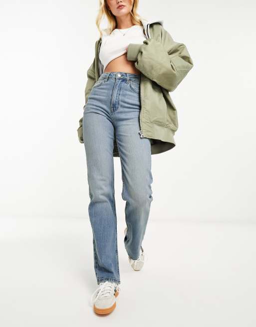 ASOS DESIGN comfort stretch straight leg jeans in mid blue