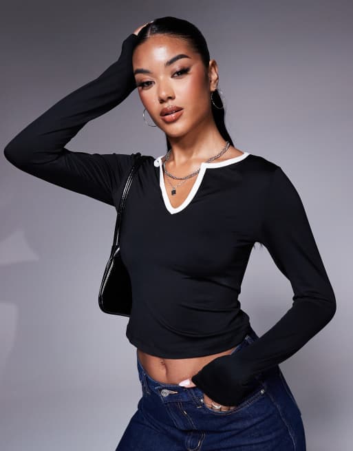 ASOS DESIGN contrast binding notch long sleeve polyamide top in black