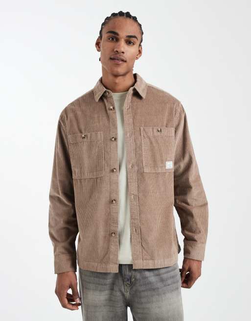 ASOS DESIGN corduroy overshirt with badge in beige