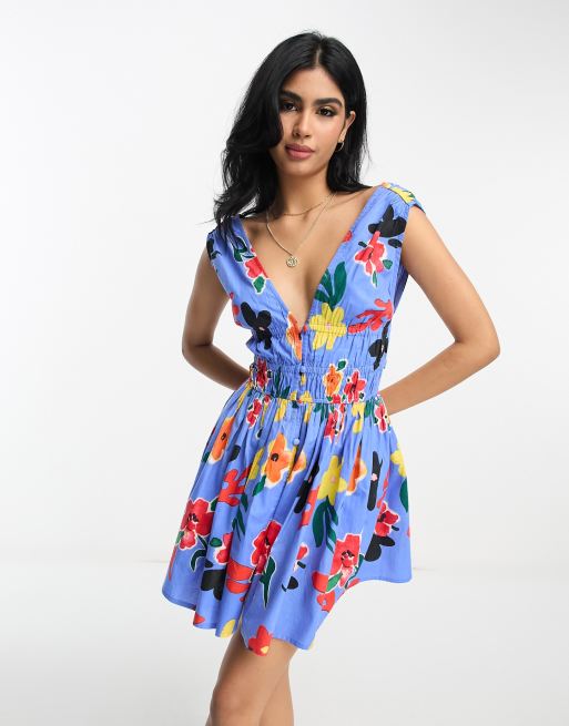 ASOS DESIGN cotton plunge button through mini sundress with elastic channel detail in bright blue floral