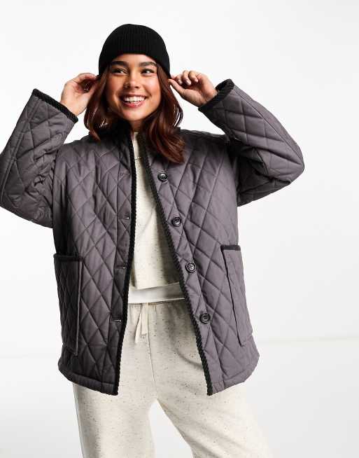 ASOS DESIGN cotton quilt jacket with cord collar in charcoal