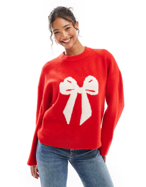 ASOS DESIGN crew neck boxy bow sweater in red