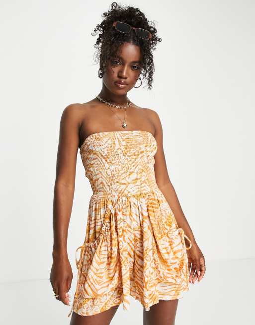 ASOS DESIGN crinkle rayon strapless slouch romper in marble animal print