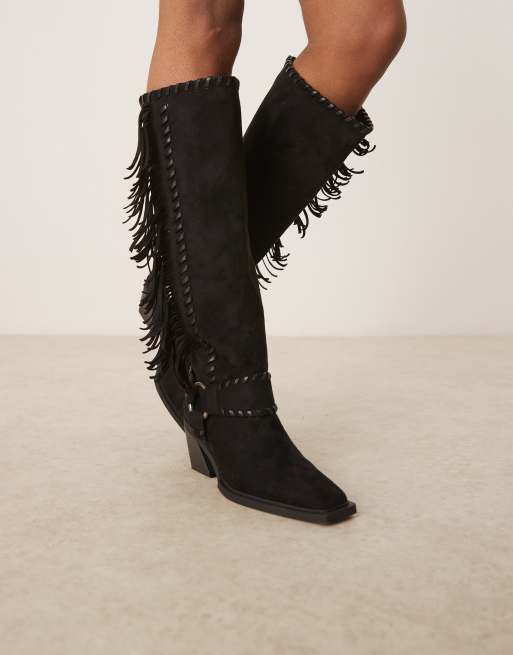 ASOS DESIGN Cristina western fringed knee boots in black