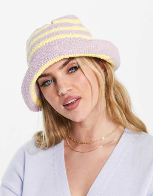 ASOS DESIGN crochet bucket hat in lilac and lemon stripe