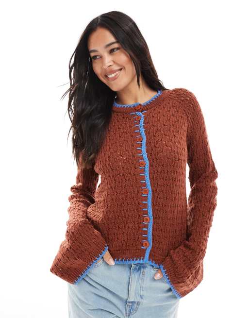 ASOS DESIGN crochet knit cardigan with blanket stitching in brown