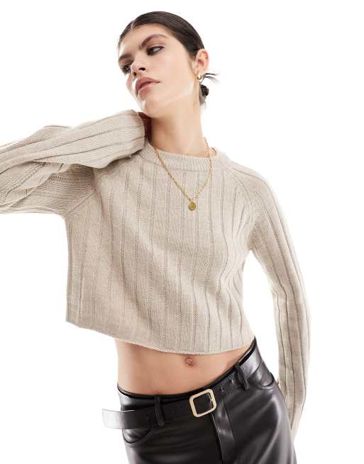 ASOS DESIGN crop sweater with crew neck in rib in stone