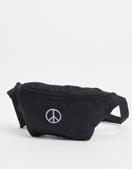 ASOS DESIGN cross-body fanny pack in black with peace sign embroidery