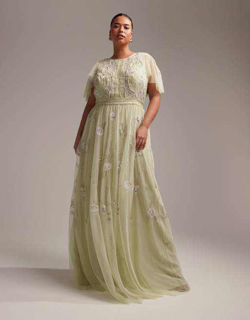 ASOS DESIGN Curve Bridesmaid pearl embellished flutter sleeve maxi dress with floral embroidery in sage