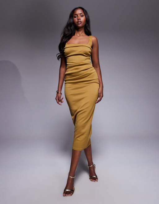 ASOS DESIGN curved neckline midi dress with split in bronze in scuba-style fabric