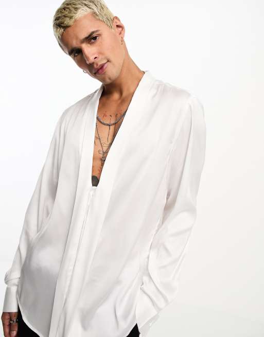 ASOS DESIGN deep shawl collar shirt with tie neck in white satin