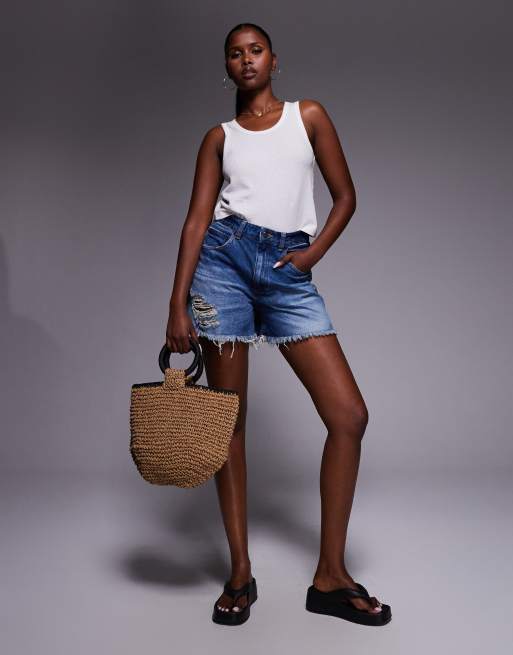 ASOS DESIGN denim longline A line short in dark midwash with rip hem