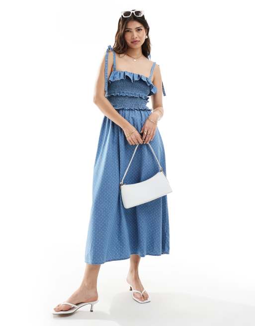 ASOS DESIGN denim maxi dress with frill detail in polka dot print