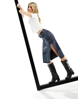 ASOS DESIGN denim midi skirt with side split in blue black wash