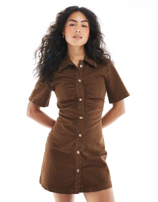 ASOS DESIGN denim ruched front mini dress in chocolate