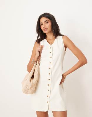 ASOS DESIGN denim sleeveless V neck dress with button up in ecru