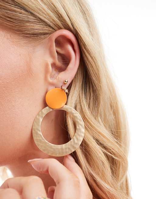 ASOS DESIGN door knocker earrings with hammered circle design and enamel detail in gold tone
