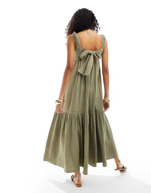 ASOS DESIGN double cloth shirred button up tie back maxi dress in sage