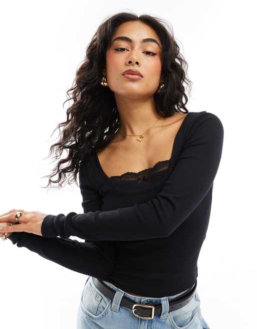 ASOS DESIGN double layer long sleeve top with lace and bow detail in black