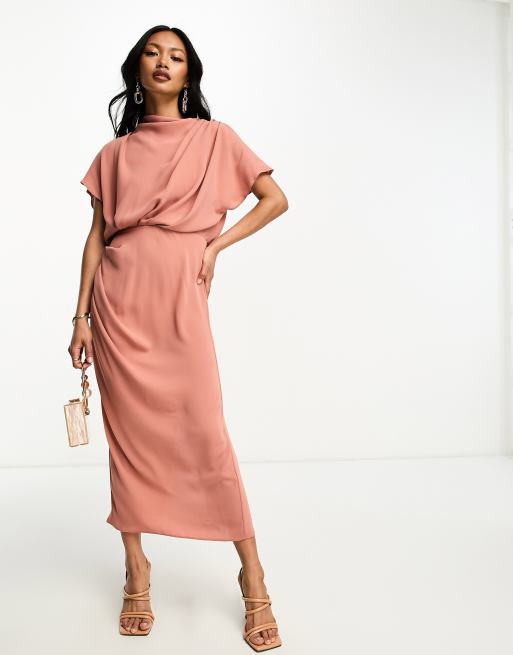 ASOS DESIGN drape front ruched side midi pencil dress in terracotta