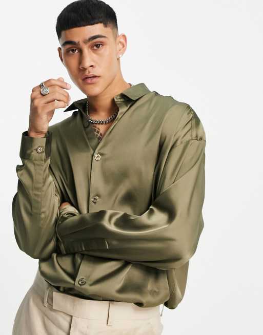 ASOS DESIGN drop shoulder oversized satin shirt with curved hem in khaki