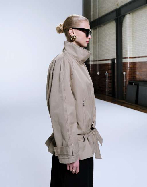 ASOS DESIGN dropped belt mid length trench coat in stone