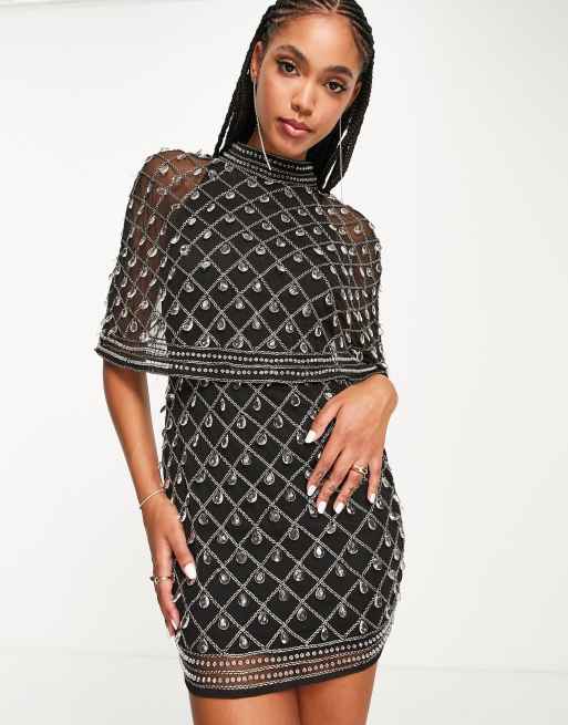 ASOS DESIGN embellished mini dress with double layer and gem embellishment detail in black